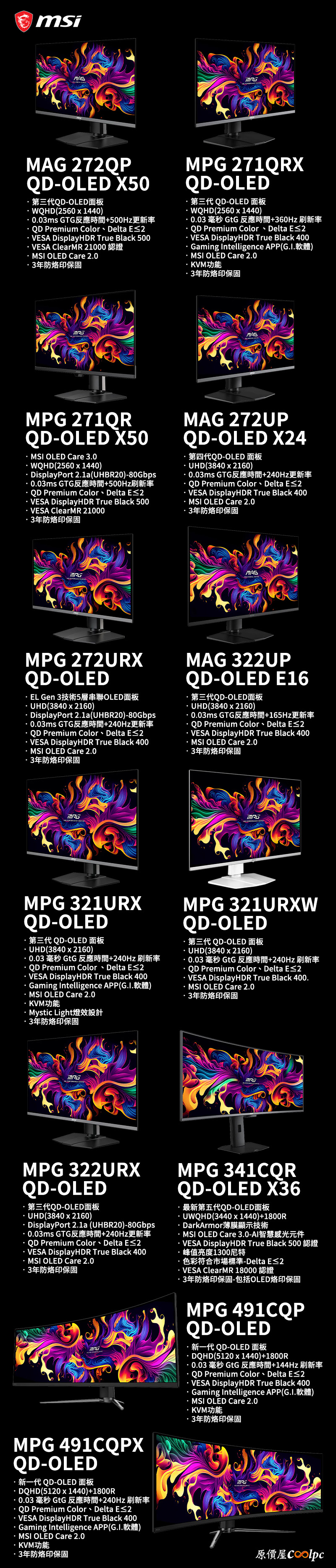 這次的MSI微星QD-OLED螢幕都具備0.03ms極速反應時間(GTG),QD Premium Color確保色彩符合Delta ≦2標準,加上VESA DisplayHDR TrueBlack 400/500認證,還有MSI OLED Care保護面板,原廠也提供3年防烙印保固。使用上因為都是電競系列,所以AI準心、AI VISION等遊戲輔助都是標配,尺寸也是玩家常見的大小,光是27″就有5款,每台的刷新率都在240Hz以上,其中以MAG 272QP QD-OLED X50、MPG 271QR QD-OLED X50的500Hz最高,且解析度還是WQHD(2560 x 1440),速度極快且畫面細緻。32″有4款都將解析度拉高到4K UHD (3840 x 2160),刷新率165/240Hz,並且除了MAG 322UP QD-OLED E16外都有G.I.(Gaming Intelligence)智能電競軟體、KVM連線、USB Type-C 90W PD快充功能。再往上是34″ 曲面 MPG 341CQR QD-OLED X36,21:9 UWQHD(3440 x 1440)解析度,擁有今天最高的1300NITS亮度。最後兩台49″ MPG 491CQP QD-OLED、MPG 491CQPX QD-OLED畫面比例變成更寬的32:9,曲度1800R,有遊戲用G.I.軟體,對多工作業更有幫助的KVM功能也沒少喔。當然好的螢幕也需要性能夠好的主機推動,正巧最近有批微星電競主機促銷(點我看),小編個人建議挑選搭配RTX5060TI以上的機種會較合適,提供給玩家們參考看看啦。