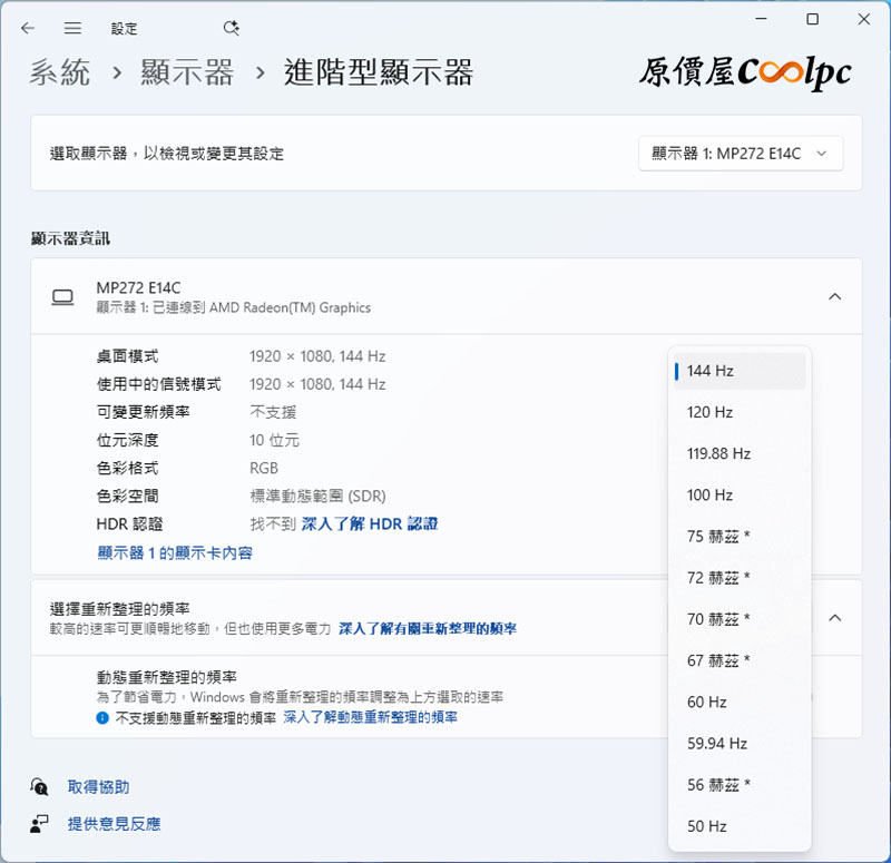 顯示器資訊顯示 1920 x 1080@144Hz。