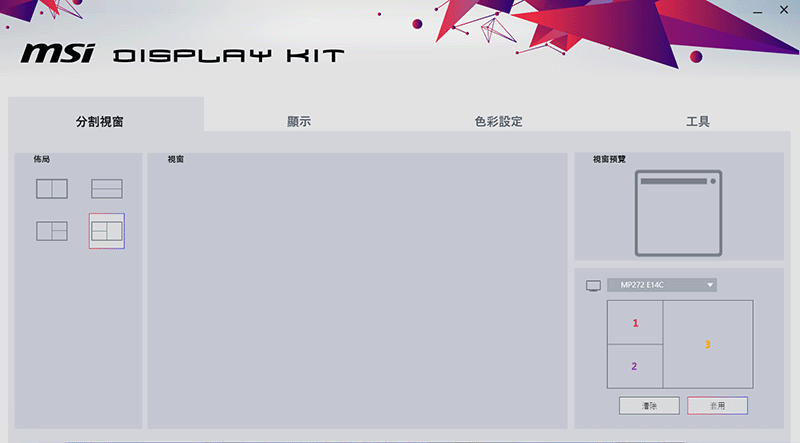 螢幕也支援微星自家的控制軟體 Display Kit App,內建多種色彩模式,無論是工作、閱讀還是看圖都能自由切換。還能用它來設定自訂視窗分割布局,比 Windows 內建的功能更靈活好用!