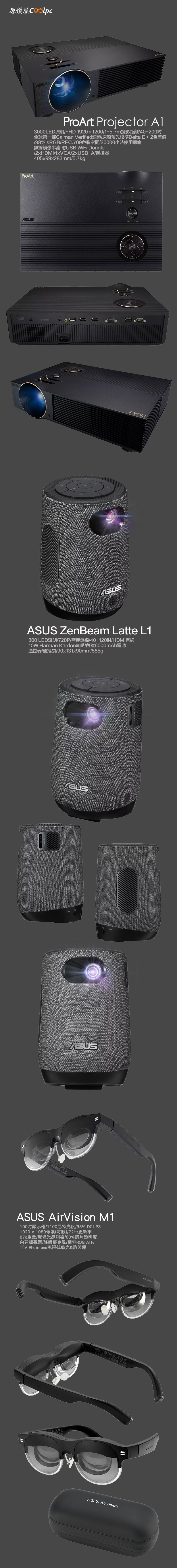 「ASUS ProArt Projector A1」投影機有出廠預先校準過的Delta E<2的色準、98% sRGB/Rec. 709色域,提供最真實且豐富的色彩,加上3000流明LED光源帶來明亮的FHD(1920 x 1080)視覺效果,畫面尺寸從40吋~200吋都行,使用壽命還高達30000小時,並內建HDMI、VGA訊號輸入源可連接各式影音裝置,或是透過IOS、Android等裝置鏡像投影。「ASUS ZenBeam Latte L1」則是便於攜帶的行動投影機,有著近似咖啡杯的外觀與尺寸,具備300流明LED光源輸出、原生720p解析度,投影尺寸從40吋到120寸不等,還內建10W Harman Kardon技術加持的立體聲藍牙喇叭,支援HDMI有線輸入,無線則可以透過手機、平板類行動裝置鏡像投影。「ASUS AirVision M1」比較特別一點,它是直接在眼鏡裡內建顯示器,單人獨享百吋大畫面,有FHD解析度(每眼)搭配72Hz更新率,支援1100尼特亮度與95% DCI-P3廣色域,並使用60%透明度鏡片方便觀察周遭環境,確保使用安全。在娛樂之餘也能透過虛擬視窗自由工作,提升多工作業生產力,眼鏡也只有87g配戴完全無負擔。USB-C介面輕鬆相容多數PC/筆電,或是ROG Ally掌機、ROG Phone等裝置。