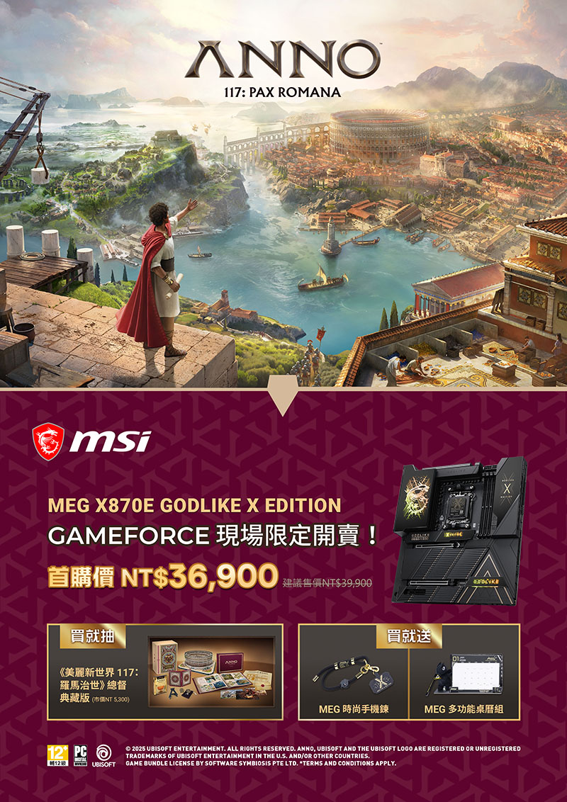 微星 GODLIKE 系列自誕生以來,即肩負著挑戰硬體極限、定義頂級規格的使命。它不只是主機板的旗艦型號,更是專為追求巔峰性能的極致超頻者、狂熱電競玩家、創作者而生。原價屋緊急到貨微星 MEG X870E GODLIKE X EDITION 十週年限量版,只為將前往 2025 GAMFORCE 盛會的廣大玩家們!全球限量 1000 片,台灣僅有的 10 片獻給 GAMFORCE 了!首波登場現折 NT$3,000,現場再送 MEG 時尚手機鍊 + MEG 多功能桌曆組,贈品到手再抽《美麗新世界 117:羅馬治世》總督典藏版(市價 NT$5,300)!當然…活動會場不僅有主機板,還有每日限量排隊商品,有螢幕、外接式 SSD、機械式鍵盤、滑鼠、顯示卡,甚至還有闖關抽 NVIDIA GeForce RTX 5090/5080 Founders Edition 創始版購買資格…甚至是超人氣實況主、啦啦隊女神都會蒞臨活動現場唷~更多活動促銷已經幫各位整理好懶人包啦!>>【GamForce 2025 Coolpc 超優惠促銷】