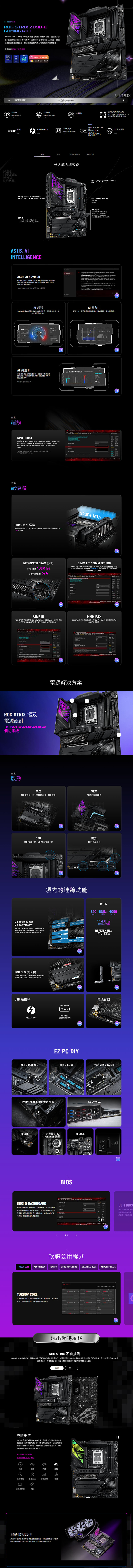 主機板採用 18+1+2+2 相電設計,確保高效能穩定發揮;支援 DDR5 記憶體最高達 8800+ MT/s (超頻),結合 NitroPath DRAM 技術與 AEMP III,提升頻率最高 400 MT/s;儲存方面提供 7 個 M.2 插槽(3 x PCIe 5.0 x4|4 x PCIe 4.0 x4),實現極速讀寫;連線功能也不容小覷,內建 WiFi 7(320 MHz,6GHz)與 5Gb 乙太網路,加上雙 Thunderbolt™ 4(40Gbps)介面,I/O 規格相當豐富。獨家 AI 技術也提供華碩 AI Advisor、AI 超頻、AI 散熱 II 與 AI 網路 II;DIY 友善設計包含 M.2 Q-Latch、M.2 Q-Release、M.2 Q-Slide、PCIe Slot Q-Release Slim,更有 Polymo 燈效與 Aura Sync RGB 控制,不僅組裝輕鬆,還能展現個人 DIY 風格!