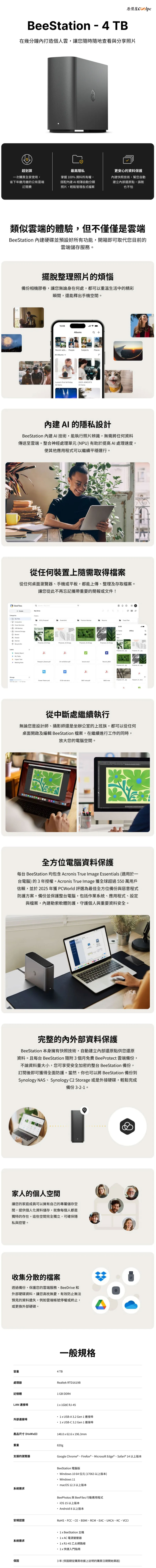 沒有複雜的設定程序,新手也能輕易安裝使用!讓用戶可以完全掌握資料或照片隱私,還能與 8 位使用者共用這 4TB 私有雲,每個人皆擁有獨立的儲存空間,不用擔心資料會與其他人的檔案混合在一起。手機與平板電腦可透過專屬的 APP 存取檔案,電腦則可使用瀏覽器、BeeStation 桌面軟體或 SMB 協定,管理硬碟內的資料與文件。簡單來說,這就是一台簡易版的 NAS 設備,透過供電與網路連接即可使用;最好再搭配一個 UPS 不斷電系統(點我查看),出門在外也能隨時隨地存取與瀏覽私有雲端資料,無須額外訂閱費用,還有三年保固!