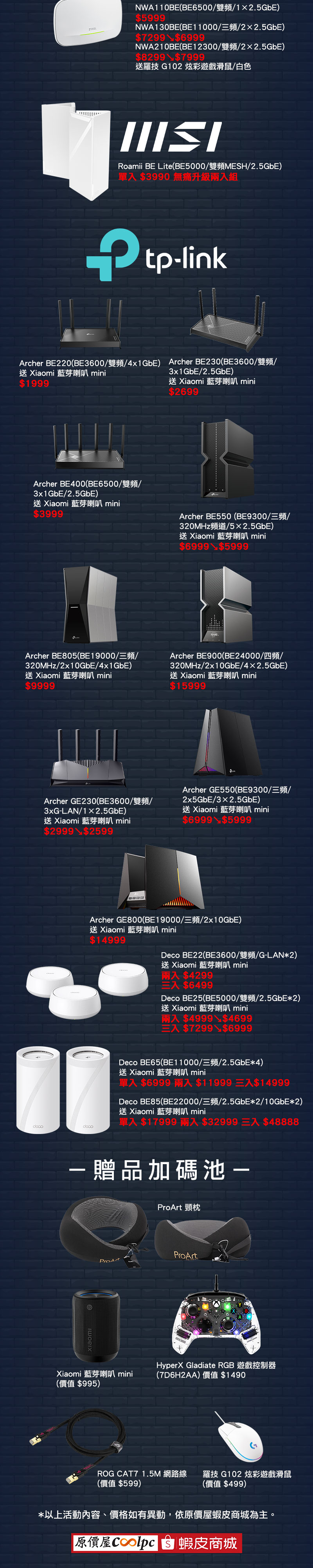 專業級玩家首選具備 320MHz 三頻完整版規格 的 ASUS TUF Gaming BE9400,帥氣戰機外型,是釋放 6GHz 頻段實力的最佳選擇;同樣追求滿血效能的還有 TP-Link Archer BE550,它是五千元內罕見支援 320MHz 頻寬的神機,前衛機身設計,深受科技迷喜愛。對於需要高穩定度的商用或工作室環境,ZyXEL 合勤 NWA130BE 則以商用級三頻規格與隱藏天線設計脫穎而出,甚至透過最低 802.3at(PoE+)即可驅動,買還送羅技 G102 滑鼠。若您的需求是解決大坪數死角,MSI 微星 Roamii BE Lite 雖然是雙頻版 Wi-Fi 7,但其 5GHz 頻段支援超越同級的 240MHz 超大頻寬(一般入門款僅 160MHz),配合 $3,990 單入價無痛升級兩入組的破盤戰略成為焦點;而 TOTOLINK BE5100 則以高覆蓋率搭配 HyperX Clutch Gladiate RGB 遊戲搖桿贈品取勝。此外,MERCUSYS 水星 MR47BE 則以最低門檻讓小資族也能體驗 Wi-Fi 7 的穩定連線。挑選時請留意,入門款雖未達 320MHz 滿血頻寬,但其新世代技術依然比 Wi-Fi 6 更強,請務必先看準清單型號,並複製好優惠代碼,時間一到準時手刀下單啦!以下為大家列出來目前促銷的品項,原價屋有開箱的品項也為大家導引開箱連結,再提醒一次活動限時限量,1/23 原價屋蝦皮商城限定嘿!