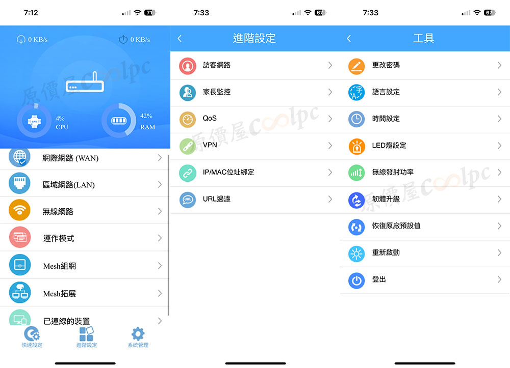 切換到進階設定,在系統狀態可以看到完整的 GUI 圖形化介面(CPU/記憶體/下載/上傳/連接數)。
