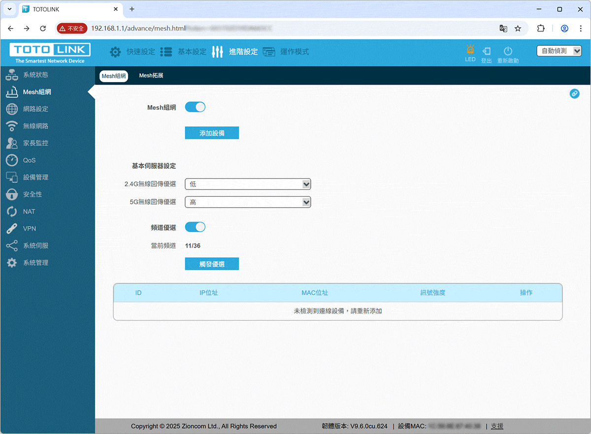 進階設定多了設備管理、 安全性、NAP、VPN、系統伺服、系統管理各項設定。細部功能設定涵蓋 MLO多重連結模式、VPN Server(L2TP)、Easy MESH 、TWT 智慧省電、MU MIMO、QoS 頻寬管理、訪客網路 SSID、家長監控、IP/Port/Mac/URL 過濾、DMZ、韌體升級、Port Forwarding、DDNS 設定、定時重啟。