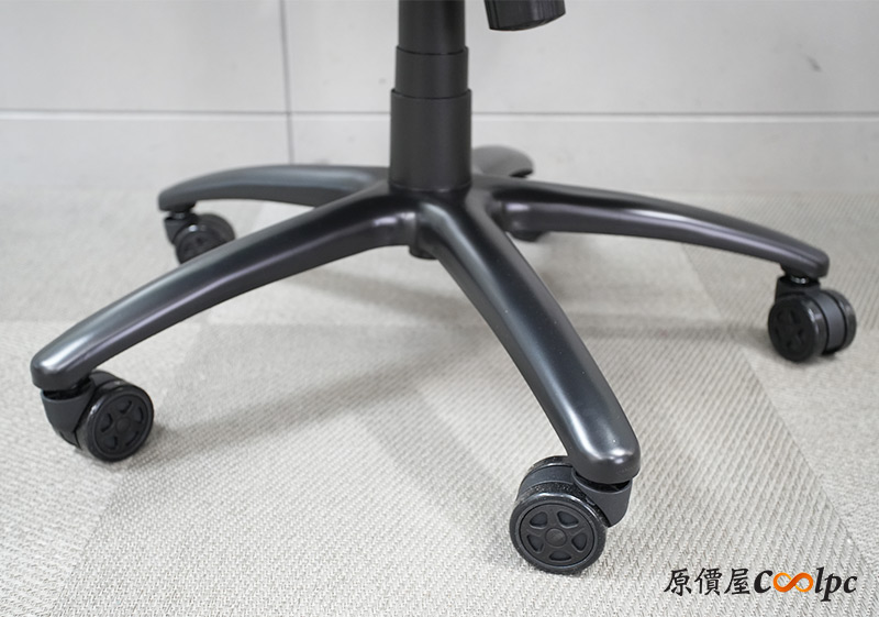 腳輪是75mm加大型設計,滾動起來阻力偏大,相對也能避免椅子自己滑動,讓椅子更穩定一些。