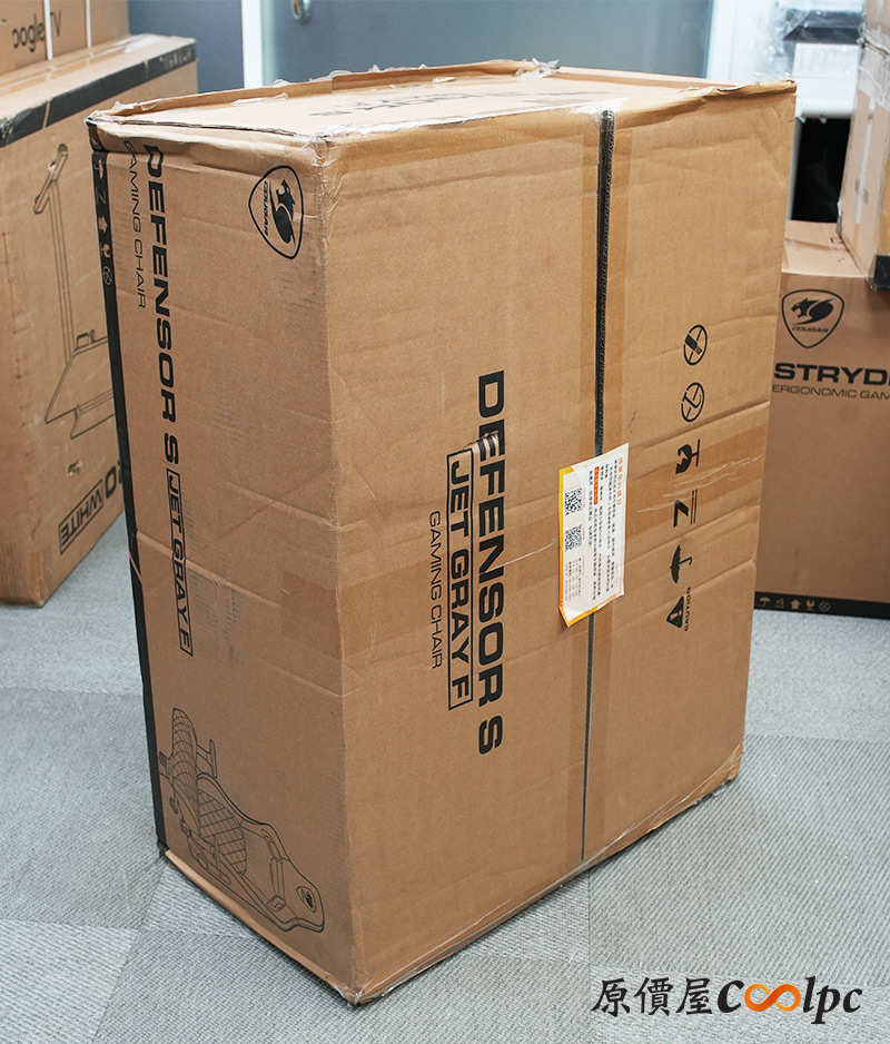 搬出來啦!電競椅還是有一定重量,大家盡量兩人一起比較輕鬆喔。這回的包裝和以往差不多,米色紙箱印上偌大的DEFENSOR S JET GRAY F字樣,側邊會有簡易的椅子圖示可以參考。