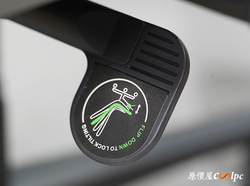 座椅還能向後搖擺,用不到時可以透過底盤的控制桿鎖定,控制桿上會有圖示與功能描述喔。