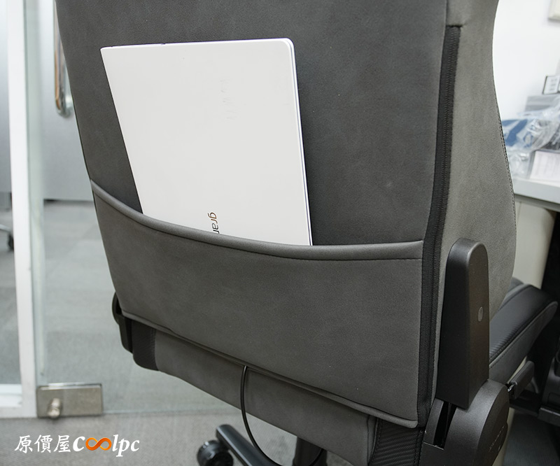 椅子背面的收納袋也還在,袋子不算特別深,不過放入筆電、掌機、鍵盤等裝備還是沒問題的。