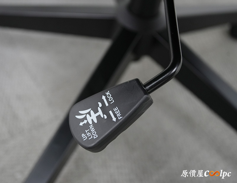 底盤有一個控制桿,坐墊升降或是椅背後仰都是由它調整,上面也有圖示可以對照功能。