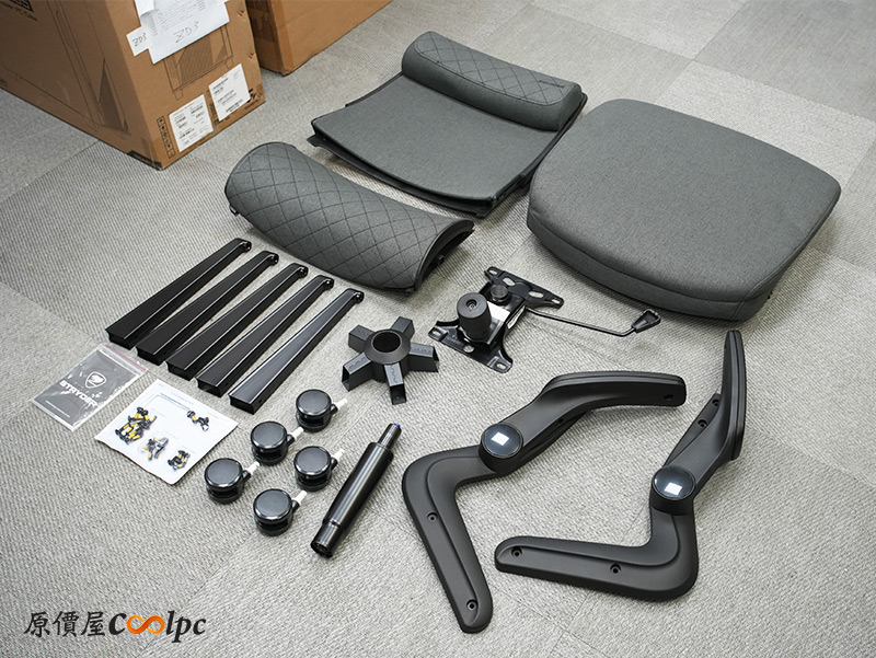 內容物有椅背、腰靠、坐墊、左右扶手、底盤、氣壓棒、椅腳半成品、腳輪、說明書、螺絲包。