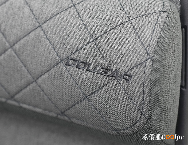 頭枕部分就同時有仿亞麻布和菱格紋縫線,質感先過關了,設計上有人體工學曲線,厚度看來也很出色,能夠給予充足的支撐。上面悄悄縫上COUGAR字樣,設計得十分低調,有助於將使用者的注意力都集中在椅子本身的特色與功能上。