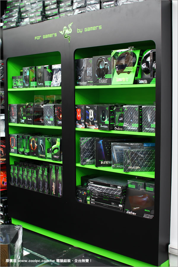 大門口電競遊戲區後方有個展台,為大家擺出來幾部液晶顯示器, 其下櫃內則有散熱器、音效卡與行車紀錄器。
