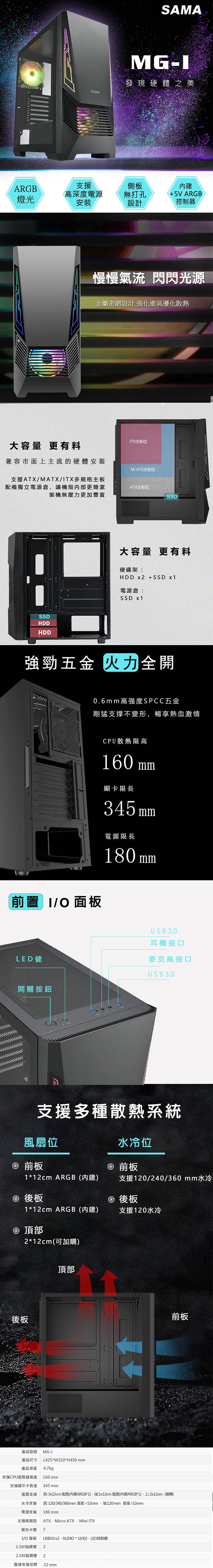 散熱空間—主流硬體完美相容:預附前/後各一 ARGB 風扇,確保內部散熱對流。機殼內部空間設計優異,可容納主流 ATX 主機板,並提供充裕的安裝彈性:顯示卡支援長度最高達 345mm、CPU 散熱器支援最高達 160mm、電源供應器長度支援 180mm。