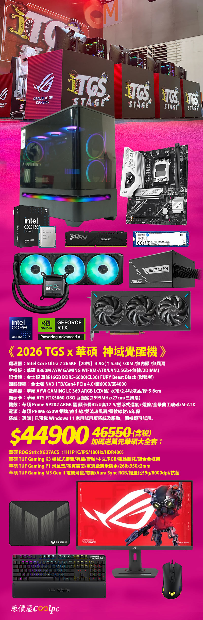 戰完展場,現在終於換你上場~2026 TGS 已熱血落幕,但真正的高潮才正開始!這批在 2026 年 TGS 展場實戰展示《三角洲行動》還火力全開的主機,如今原價屋要正式釋出啦~它還有個霸氣的名字《TGS x 華碩》神域覺醒機!因為它不是單純的電腦,而是一台從展場走下來、帶著鎂光燈與高效能加持的戰鬥裝備。這批限量僅 34 台,竟然只需用 $44900 不到五萬的價格就能擁有!甚至還要送出近萬元的華碩禮品,從 27 吋螢幕、鍵盤、滑鼠到鼠墊都通通包給你~當然啦,最重要的保固也絕不會縮水,一定從你購買的那天才開始算起。因為我們原價屋從主機組裝、活動進場、安裝設定、撤場處理皆全程親力親為自己包辦!絕對是細心呵護對待每台電腦,所以有興趣的玩家朋友真的不用擔心,這台絕對是買到賺很大~