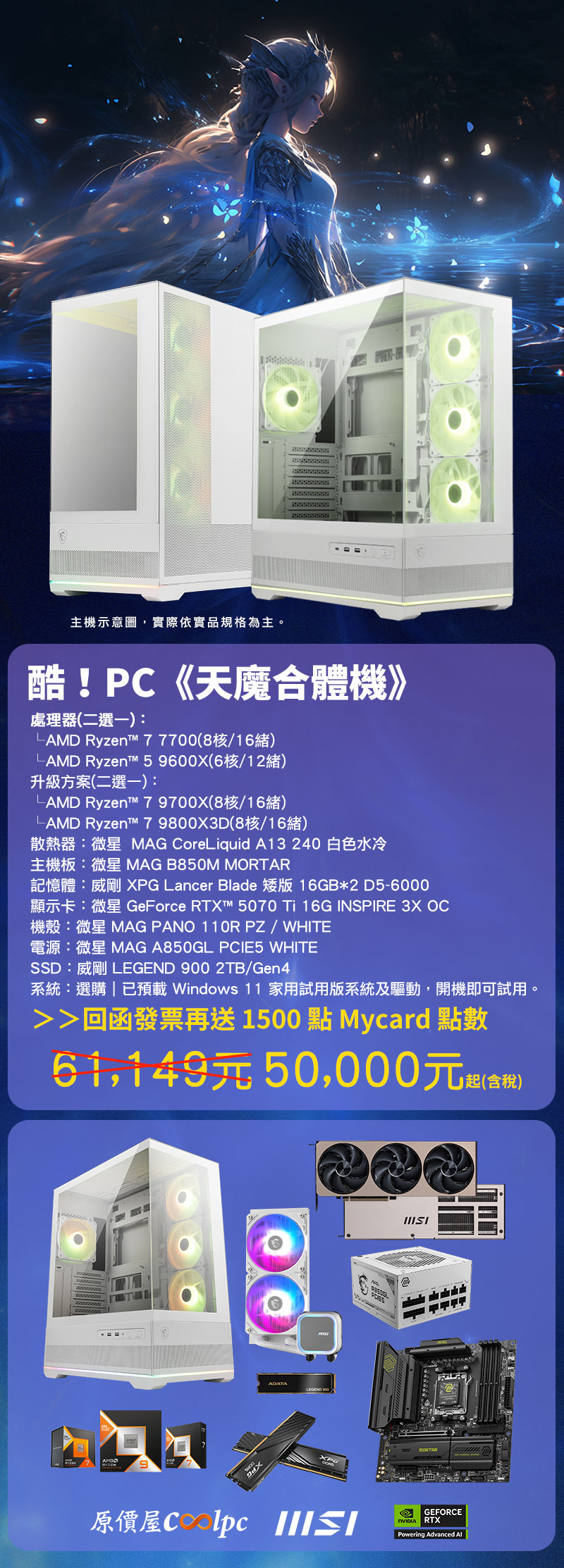 上回酷!PC《天族/魔族》搶購一空,AION 2 遊戲的魅力果然不容小覷!這次別再錯過微星 x 原價屋酷!PC《天魔合體機》,內含 Ryzen 7700/9600X/9700X/9800X3D、RTX 5070 Ti 顯示卡,搭配用料扎實且擴充豐富的微星 B850 迫擊砲主機板,再送 Wi-Fi 6E + 藍牙功能無線網卡,強迫你一次到位!本檔不僅最高現折萬元以上,回函再索取 1500 點 Mycard 點數,C/P 值頂到同業都瘋狂!原價屋首次免費組裝 + 預載試用版作業系統、零失誤完美交機 = 開機即享受!限量售完為止,趕緊透過原價屋線上估價系統下單囉!