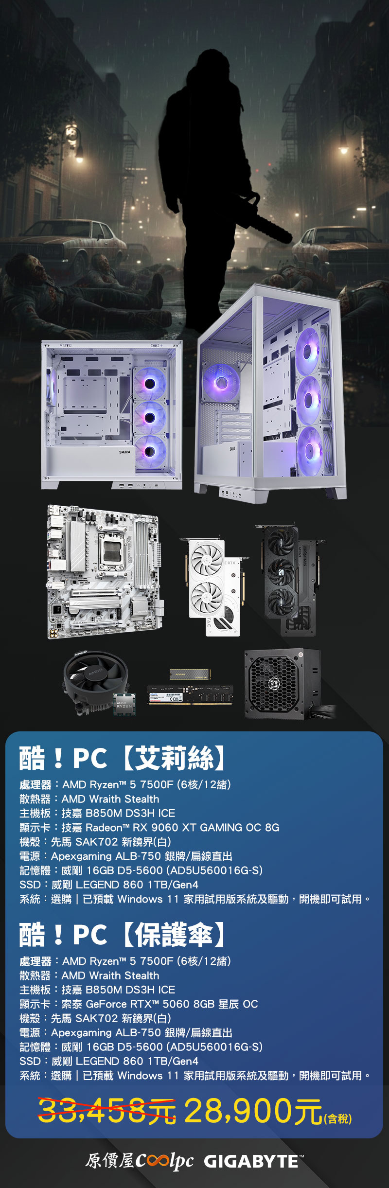 酷!PC【艾莉絲】專屬戰力|技嘉 Radeon™ RX 9060 XT GAMING OC 8G 顯示卡:承襲技嘉經典風之力散熱系統,三顆獨特刀鋒導流風扇搭配正逆轉功能,大幅減少擾流並提升風壓。金屬背板不僅強化整體結構,更賦予顯示卡強悍的工業美學。技術面採用最新 RDNA 4 架構,更導入全新硬體光線追蹤加速器與 FSR 4 補幀技術,讓你在《惡靈古堡 安魂曲》的高壓場景中,同時細品畫面細節。酷!PC【保護傘】專屬武裝|索泰 GeForce RTX™ 5060 8GB 星辰 OC 顯示卡:將星軌線和宇宙深空景象相結合,簡潔優雅的線條雕刻工藝,搭載雙風扇及金屬背板,與純白色系質感相輔相成。技術面採用 NVIDIA Blackwell 架構並支援 DLSS 4,確保你在遊戲和 AI 領域一展長才。