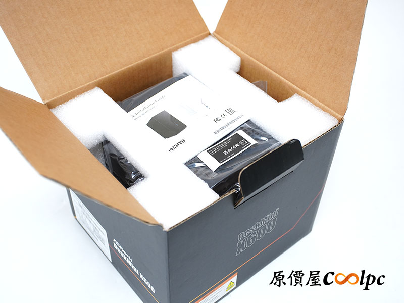 內容物除了華擎 DeskMini X600 小主機,還有 AMD 專用散熱器、硬碟螺絲、止滑墊、2 x SATA 排線、變壓器、電源線、說明書,變壓器型號為 FSP120-ABBU3,支援 100~240V 1.4A 50-60Hz 輸入,可輸出 19V 6.32A(120W),採用梅花頭插孔設計。
