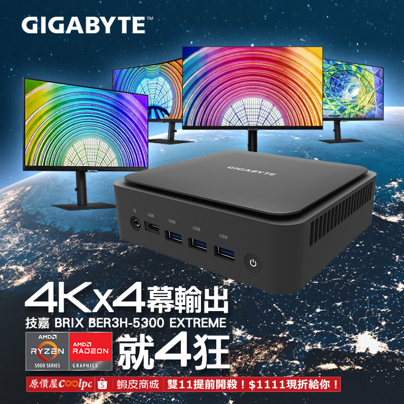 Mini PC 也能大肆支援?原來是技嘉的 BRIX BER3H-5300 EXTREME 小主機才這麼囂張啦~它可是擁有 4K 4 螢幕輸出的強大支援性(2 x HDMI 2.0b、Type-C DP 1.4b、Mini DP 1.4b)!還採用 4 核 8 緒的 AMD 5300U 處理器,8G 的記憶體+250G 的 SSD,還直接幫你裝上正版 Windows 11 作業系統,除了能順跑 4K 影音外,不管是處理文書工作還是進行基礎遊戲,這台價格只要萬元出頭的 Mini PC 真的是非常值得考慮啊~尤其這個月還搭上了1111的月促銷活動,現在只要來原價屋買,就享有直接折扣$1111的金額喔!數量與活動時間皆有限,各位玩家朋友不要在猶豫啦!