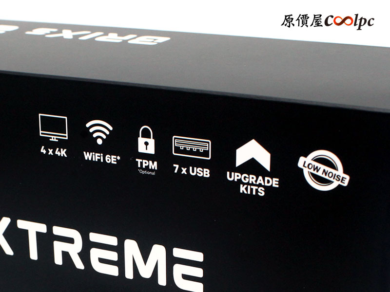 BRIX Extreme 包裝使用滑套設計,黑底白字風格,從正面便可看出豐富的 I/O 配置,右上方再列出其他重點特色,支援 4 x 4K 螢幕輸出、最新 WiFi 6E 無線技術,多個 USB Port 以及支援升級套裝擴充,側邊則可看見 AMD Ryzen 5000 系列及 AMD Radeon Graphics Logo,若要以小主機來說,AMD 機種的名氣還是大了不少!背面則展示了主機 I/O 配置圖以及升級套件應用示意圖,其實 5500U/5700U 兩款配置都一樣,只差在處理器不同,目前標配的升級套件都是 2 x M.2 SSD 擴充,另一種套件則是加入第二個 Lan port、M.2 SSD、RS232 端口(RJ45) ,不過據我所知,若想購買這套件,原廠會以大量採購的方案客訂出貨。