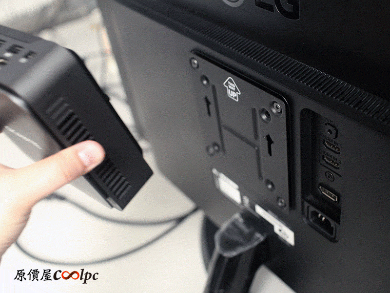 將壁掛架先鎖在螢幕後方,壁掛用螺絲鎖在小主機上,掛上去就可以變身成 All In One 主機啦,壁掛架可支援 75 x 75mm、100 x 100mm。