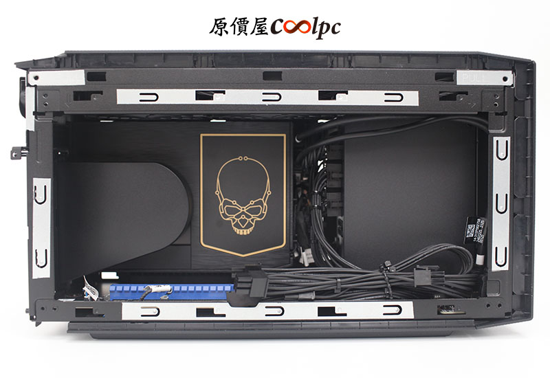 本體露出,整咖機殼的外貌承襲經典骷髏系列,上頭可以看見大量的蜂巢狀元素,甚至蔓延到兩側及頂端的防塵濾網,而前端這個素面大面板可是別有用心阿,等等開機就知道了,嘿嘿~