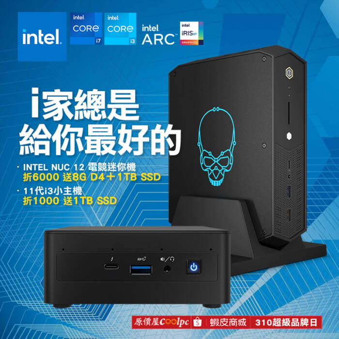 雖然說明天才是310,但每當有超級品牌日的時候,Intel都會大方的推出好康活動!當然這次也不例外~甚至這次還提早一天開跑咧!這回Intel也特別選了擁有獨立顯示卡A770M、12代i7 CPU處理器的「Intel NUC 12 Enthusiast Mini(RNUC12SNKI72000)」打先鋒!這台堪稱最小最強的電競機竟然要打折了耶,而且一折就折他個6000大洋!甚至我們還要加送你「美光 8G DDR4-3200+P2 1TB M.2 SSD」,這麼好康的機會你怎麼能錯過啦!當然我們也有想到一般需求的玩家朋友,所以這別準備另一台熱門NUC小主機在這次的活動中,採用11代i3 CPU處理器的「Intel NUC 11 Performance kit(RNUC11PAHI30Z00)」,也是擁有非常精巧的體積,豐富的擴充度以及具備2.5G LAN、Wi-Fi 6&BT5.2等技術,對於一般的使用族群來說,這台的使用真的相當全面了,當然這次活動也有相當不錯的降價,另外也要加碼送美光的P2 1TB M.2 SSD,真的也是不可錯過的入手好機會喔!活動從今天開跑,3/17截止,說不定明天310超級品牌日就賣完了,各位要好好把握動作要快啊!