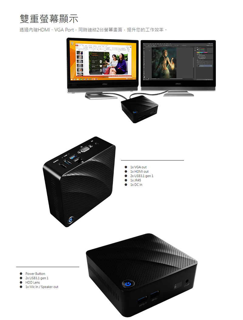能應付4K影音、文書需求的機種各式各樣,沒有一點姿色當然不敢拿出來啦!這回原價屋帶來MSI Cubi N小主機,搭載Intel Celeron N4000(2C2T)處理器、4G DDR4-2400記憶體、64G SSD,I/O部分提供4埠USB 3.2 Gen1、HDMI/D-SUB、支援雙螢幕輸出、支援HEVC/H.265解碼,同時提供802.11ac無線網路晶片+藍芽4.0,內附Windows 10 PRO版作業系統,這也就意味著他具備網域功能、遠端操作功能、群組原則管理功能,不僅是能勝任文書、影音、掛BT、還多了簡易伺服器的用途