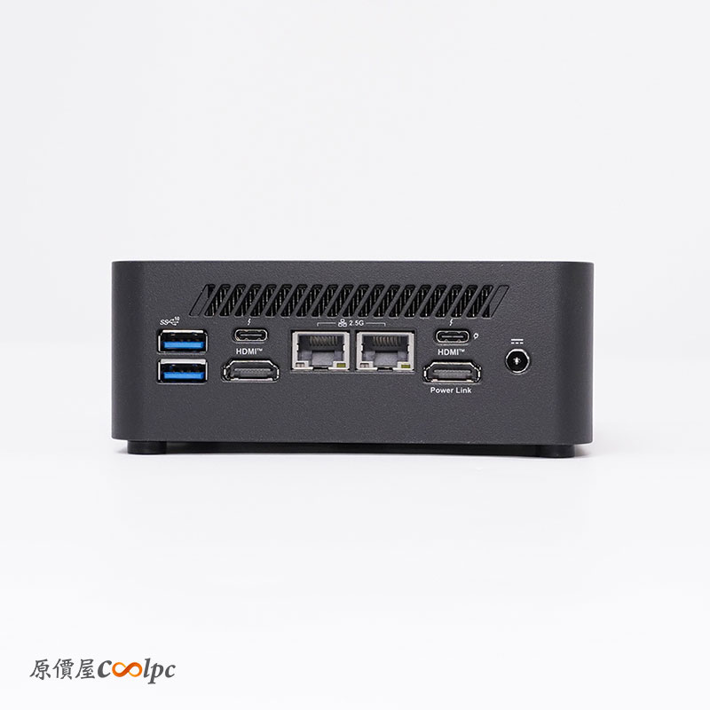 背面 I/O 從左到右則是 2 x USB 3.2 Gen2 Type-A (10Gbps)、 2 x HDMI 2.1 (supports 4K @60Hz,其中一個支援Power Link) 、2 x Thunderbolt 4 ((DP 1.4 alt-mode up to 4K@60Hz / PD-out 15W,其中一個支援 PD-in up to 100W )、2 x 2.5 GbE 網路埠、變壓器插孔;介面上方還有開一排散熱孔,隱約可以看到散熱鰭片。