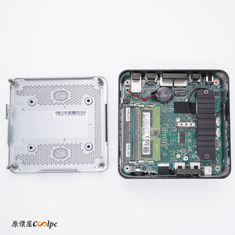 將底部四根螺絲鬆開後,可以看到內部架構,小編開的是 Intel Core 5 120U 版本,內建一支記憶體(可再擴充一支)和 M.2 SSD,M.2 SSD 還有散熱片可以有效降低 SSD 溫度,旁邊還有一個 2242 規格的 M.2 插槽,市面上非常少有這特殊規格,若要擴充的話可能得先查一下有沒有販售!