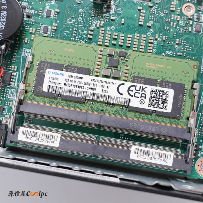內建一支三星 OEM 8GB DDR5 SODIMM 5600MHz 記憶體,可再擴充一支 DDR5 SODIMM 記憶體,目前市面上沒有販售三星 OEM 的記憶體,所以擴充沒辦法兩支都相同品牌,除非你多花錢把內建的換更大的容量,不然單買一支擴充都是不同廠牌。