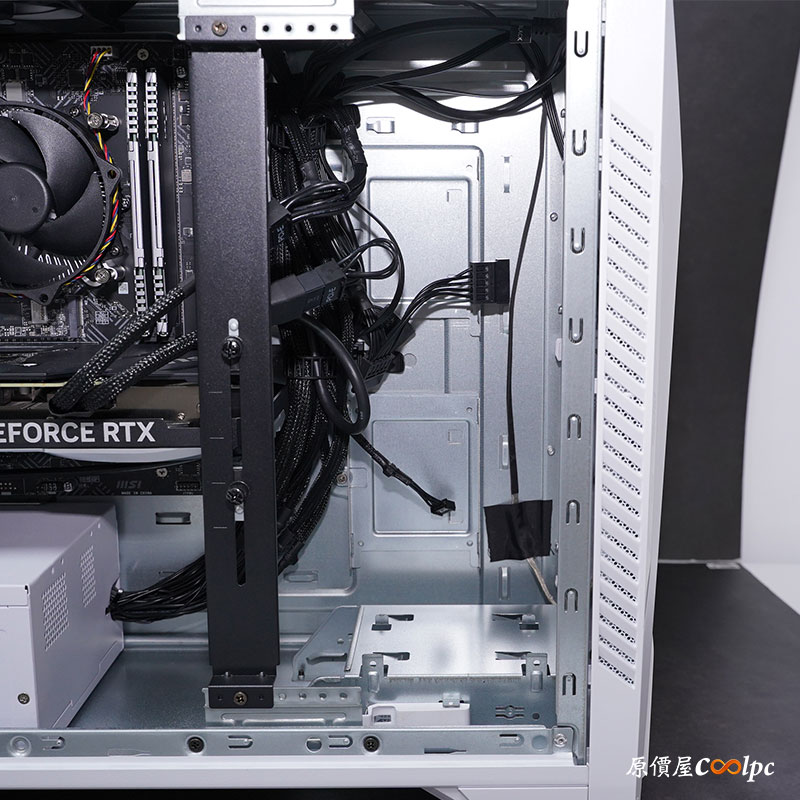 打開內部側板看一下擴充空間,內附一支黑色顯卡支撐架,除了能夠防止顯卡 PCB 板歪斜之外,這支桿子也算是加強機殼結構,讓它能夠更加堅固。