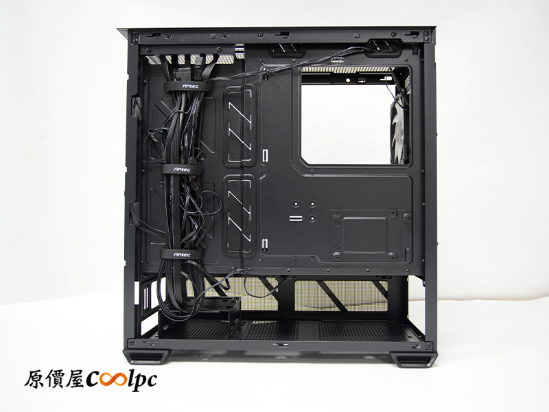 背面理線空間相當寬裕,預留的走線深度約為 1 cm,原廠在出廠時已將內部線材預先理順,大幅簡化了裝機流程。左側配置三條魔鬼氈束線帶,方便玩家將線材集中固定;主機板安裝位旁則加入橡膠護圈,能隱藏雜亂線材並提升整體裝機後的視覺整潔度。