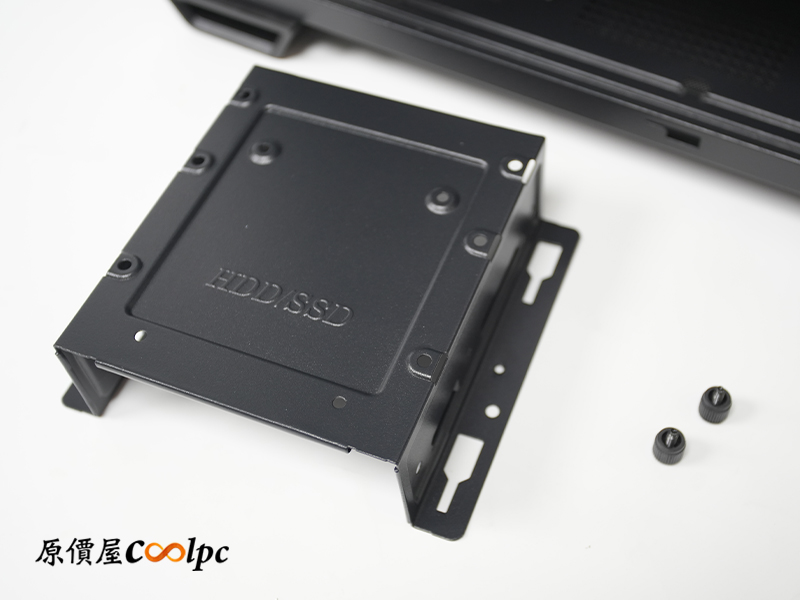 硬碟支架位於機殼底部,並採用兩顆手轉螺絲固定,不需工具即可輕鬆拆卸。如果電源比較長也可以單獨拆下來,方便收納多餘的線材或因應大瓦數電源的長度需求。