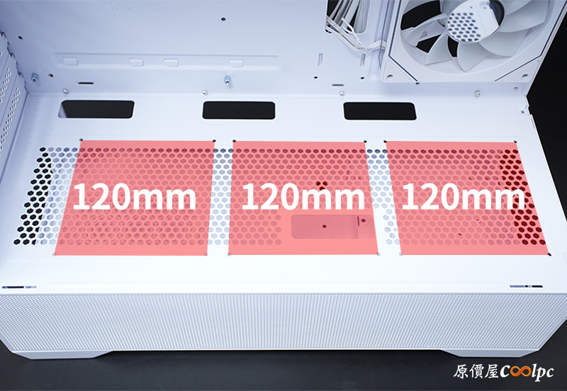 頂部支援3顆120mm或2顆140mm風扇,水冷可裝360/280/240mm等尺寸冷排,挑高設計預防冷排和主機板散熱模組衝突,不過官方仍建議冷排+風扇厚度不要高於52mm喔。