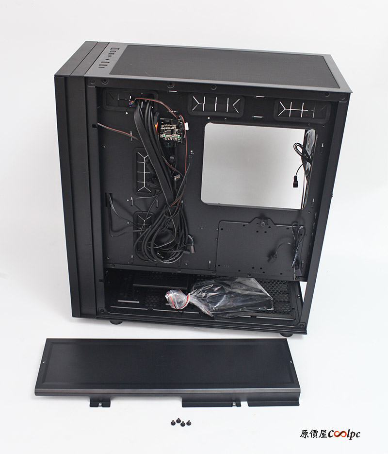 卸除了玻璃,第一眼就看到了整潔的內部架構,因為這邊別設計了一塊理線遮罩,主要就是為了要呈現組裝完成、裝上鋼化玻璃還能擁有的俐落感,這個設計真的蠻重要的。