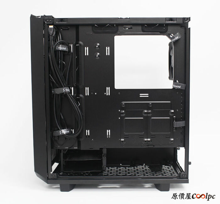 接著就來看看機殼內部構造,這咖FD Meshify 2 Compact就像是沒有擺家具空房間,有的是空間讓大家自由發揮,而且也能確保空氣進出順暢,對於機殼散熱也是有幫助。主機板支援ATX、M-ATX、ITX等主流規格,同時有大量的整線孔洞可以利用,足夠幫玩家們省下不少思考走線時間了。