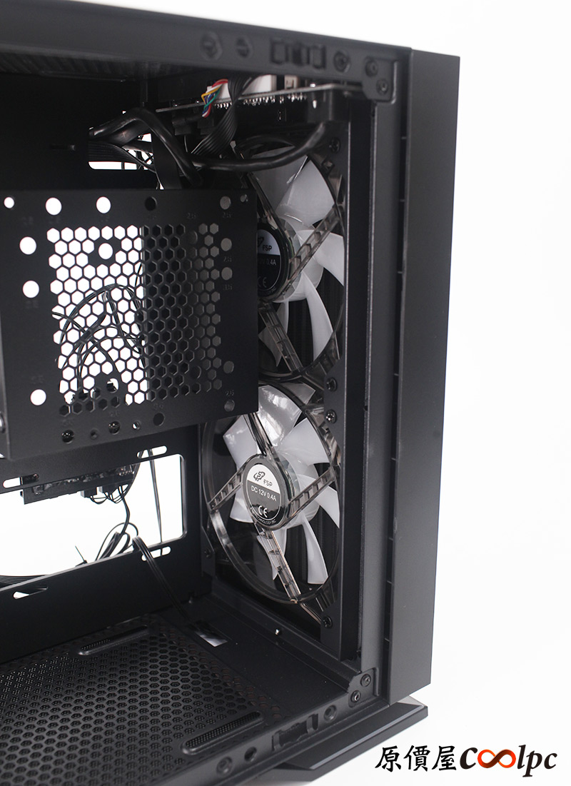 靠近前方的兩顆內建12cm風扇,裝在外側並具備A.RGB燈光效果。