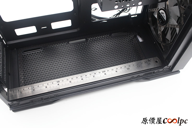 拆掉硬碟支架可以在底部裝兩顆12cm風扇或者240mm水冷。