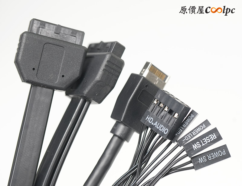 機殼線材的部分,因為USB3.2 Gen1 Type-A有4個,所以USB19 Pin跟著變成兩條,USB3.2 Gen2 Type-C則對照到USB 20Pin,音源孔需要一條HD AUDIO,剩下則是POWER SW、RESET SW、POWER LED±。