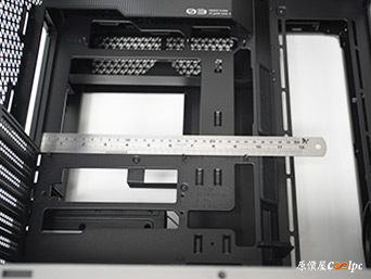 中間是電源供應器安裝位置,長度限制180mm,已經能容納大多數的電源款式,而且前面也還有空間做線材管理,電源也能透過右側板的開孔直接獲得新鮮空氣,就連電源散熱都有兼顧。