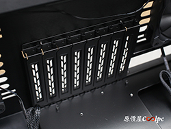 而硬碟支架一共是附3組,單一支架共有3顆3.5吋裝置/1顆2.5吋+2顆3.5吋裝置兩種安裝方式,換句話說Lian Li DK-04F電腦升降桌最多可安裝9顆3.5吋裝置,或是6顆3.5吋裝置+3顆2.5吋裝置,針對3.5吋裝置特別加入防震軟墊設計,單就儲存空間的擴充性來看是非常寬裕了。