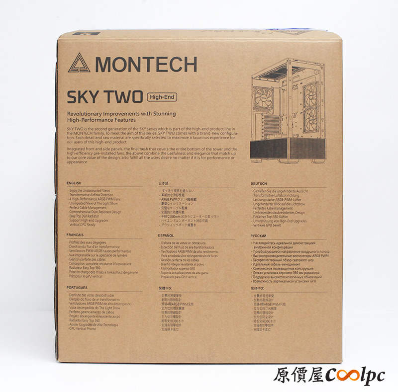 背面是機殼多國語言版特色,這回Montech SKY TWO機殼無論散熱架構與造型設計都有創新,全景玻璃的視覺饗宴,內建4顆12cm A.RGB PWM風扇,支援360mm水冷,全方位防塵還能支援顯卡直立等等,不外乎就是為了提供更好的效能表現,究竟有沒有這回事,馬上我們就要拆封揭曉了。