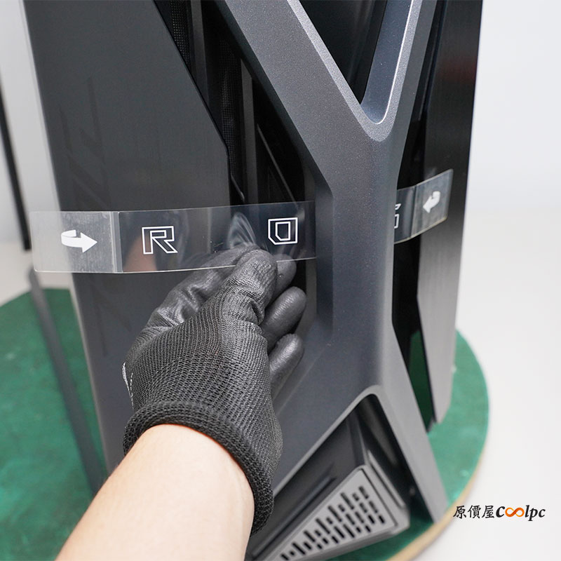 要打開兩側的側板務必將前方的透明ROG塑膠貼紙拆開!它黏的蠻緊的,需要用指甲摳邊邊才有辦法將它拿下來。