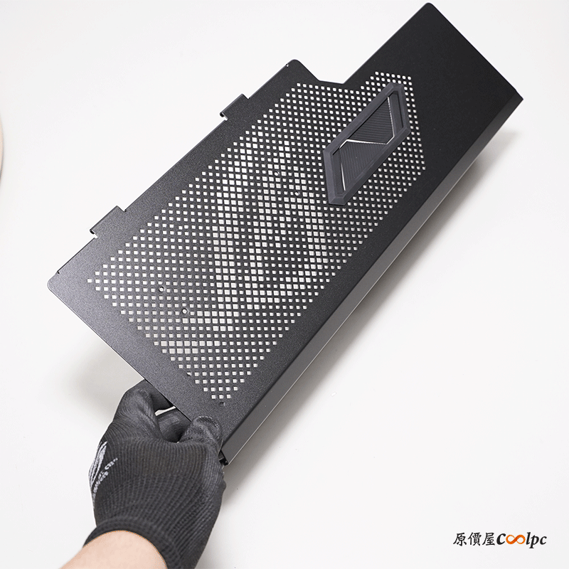 華碩ROG HYPERION 機殼廬山真面目現身啦!超浮誇的鋁合金X造型外觀設計,延伸至手把和腳架毫無違和感!手把可是能負載80公斤的重量啊,可以說是相當堅固耶!從正面來看簍空的X造型旁邊有氣流散熱設計,上下則是採用三角線條造型點綴,過電會有RGB燈光效果!兩側燻黑鋼化玻璃採用磁吸式設計,不需要手轉螺絲即可輕鬆拆裝,磁吸式面板為相當有質感的髮絲紋,左側還有雷雕的ROG字體。背面的部分可以看到上方可拆式上蓋,電源供應器採用下置設計,風扇和SLOT檔板以及右側鋼板都有六角長方形的開孔,讓機殼內的風流能夠快速地排出機殼外。
