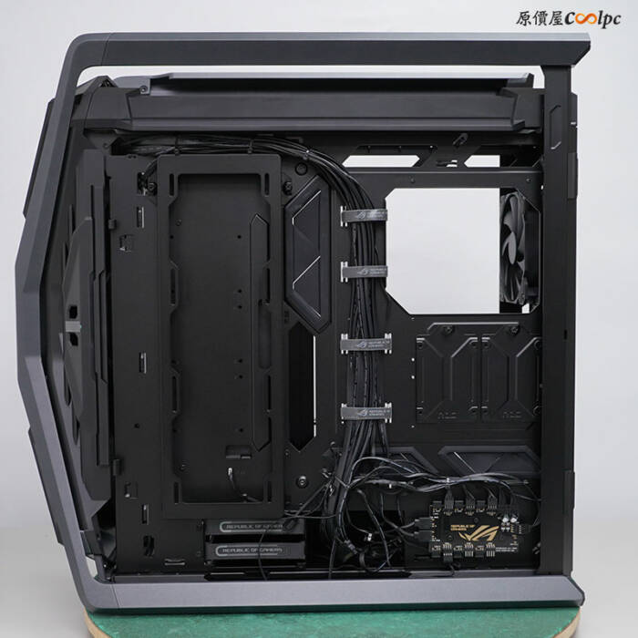 內部是真的相當寬闊啊!最大可是支援E-ATX規格主機板,這次右側還多加了ROG燈板!以可以拆掉單獨使用,等等會有說明,讓我們繼續看下去,還有出線孔採用了線條三角造型的橡膠,讓它看起來不會空塊在那影響美觀,電源艙也有一個專門給顯卡用的開孔,嘿嘿有看到邪惡之眼嗎?