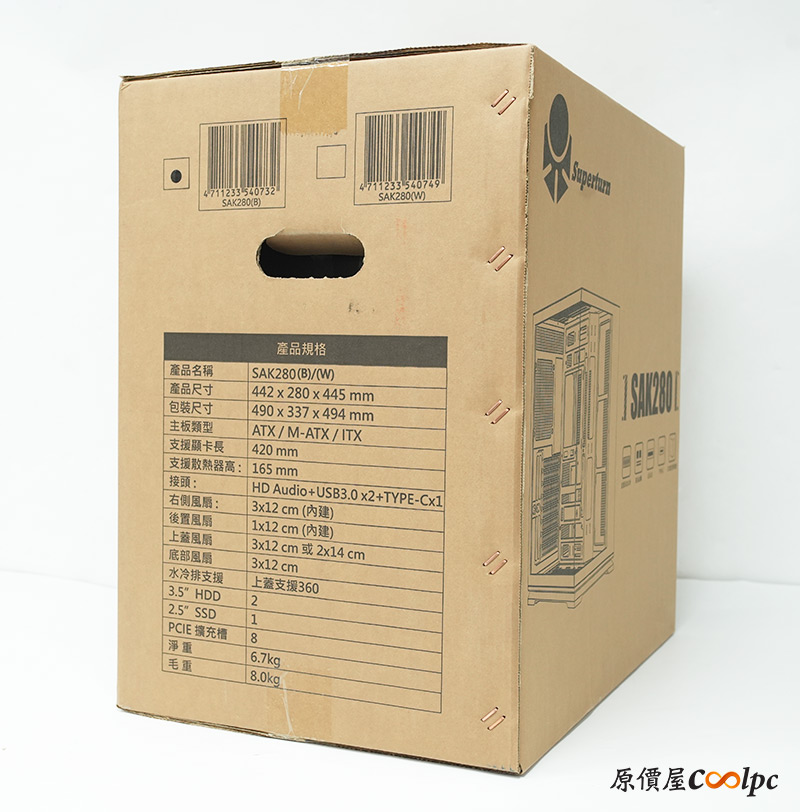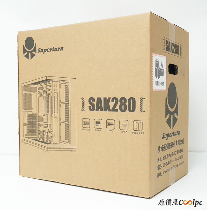 外箱上有機殼簡圖與型號SAK280字樣,並標示機殼特色270°全景透側,支援360mm水冷,面板拆卸簡易,還提供USB Type-C、USB Type-A連接埠。