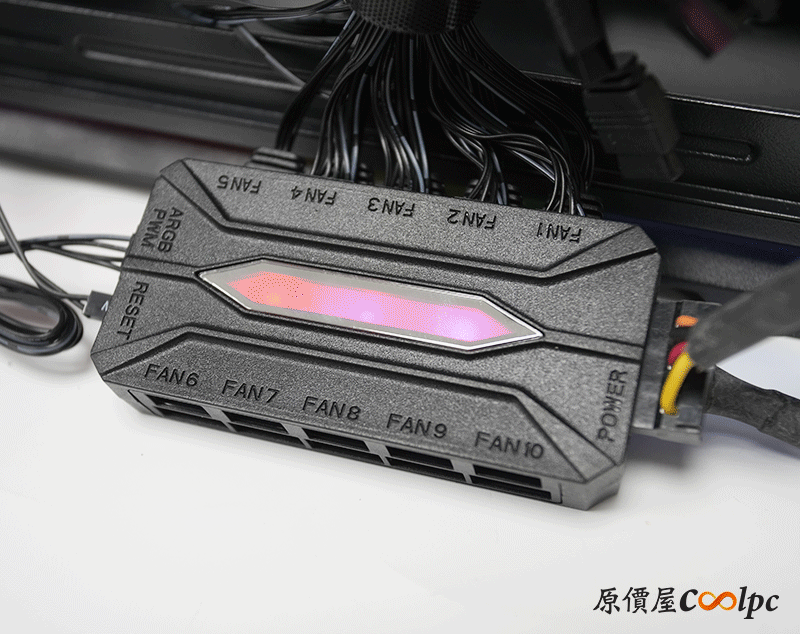 接上電囉~ ARGB控制器自己會發光,意不意外? 其實這個控制器我們之前在其他機殼有玩過,現在算是重溫舊夢了。