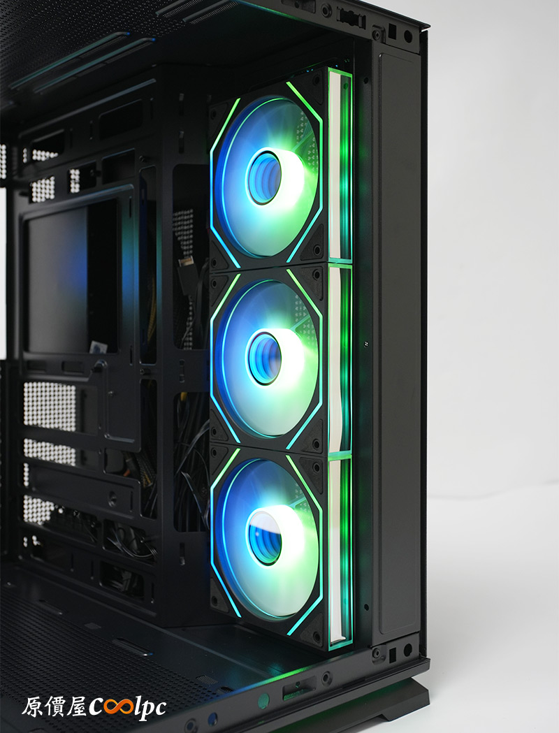 側邊3顆120mm ARGB風扇是反向扇設計,不僅能引導新鮮空氣進入,內側這面的ARGB效果也較好,仔細看還能發現風扇中央有無限鏡像效果,風扇框架上有ARGB燈條,框架側邊也是鏡像設計。